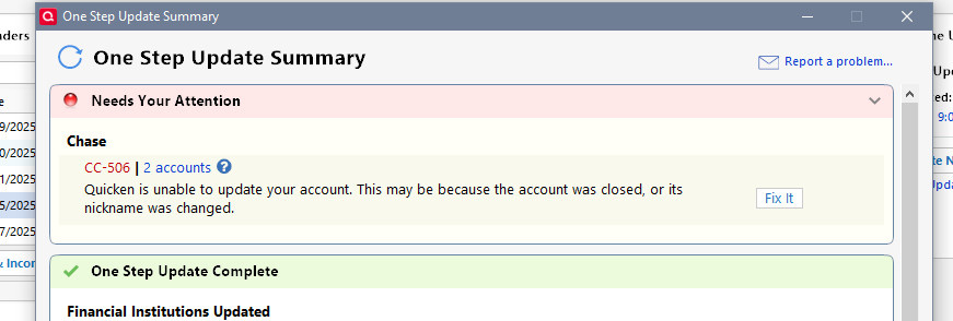Chase CC accounts are throwing CC-506 errors in Windows today. On e of the interesting things about running both Quicken and Mac is seeing how they handle things differently. No such error in my Mac Quicken installation, same accounts. Nothing changed on my end.