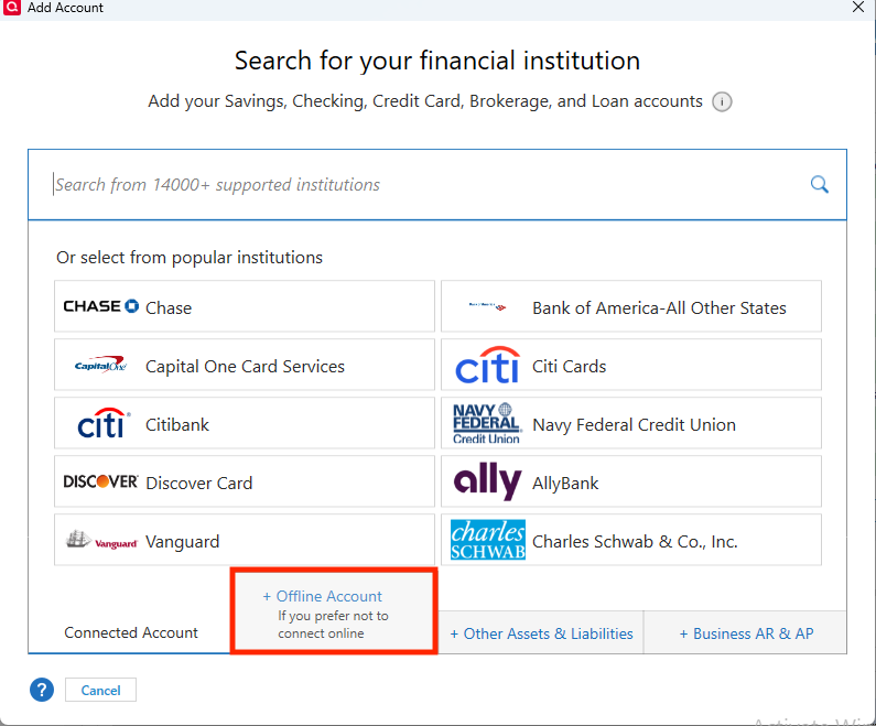 - Go to Tools>Add Account, follow the prompts, and make sure to link to the offline account you created to the financial institution (Note - Make sure to check for, and delete or match any duplicate transactions that download).