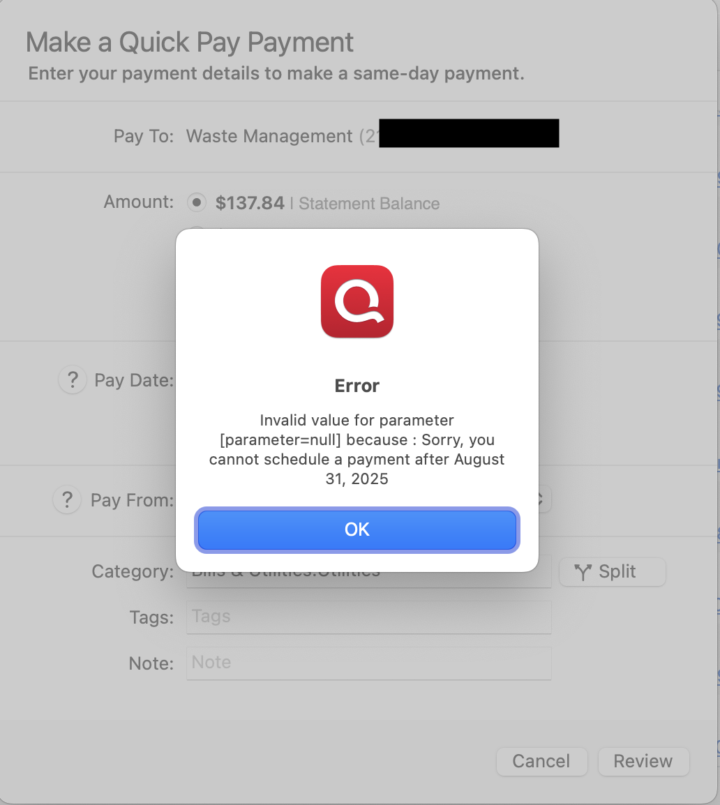 This happens on any bill I want to schedule after 8/31/25 using QuickPay.