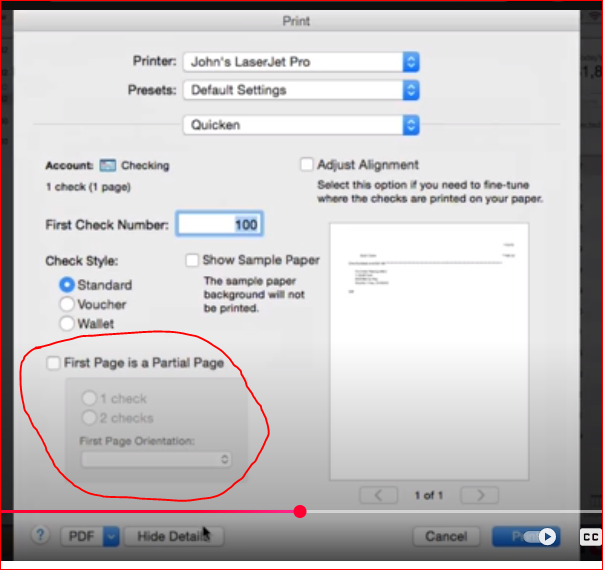 Out of curiosity … what make and model printer are you using for printing checks? And how easy or difficult is it to run partial pages thru the printer?I'm using a Canon G3270 printer. I print Voucher checks (one business size check and 2 stubs per sheet) because I find they are easiest to load and use.