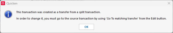 using QW for over 30 years. Lately I get this pop up on every transaction update: "This transaction was created as a transfer from a split transaction." "In order to change it, you must go to the source transaction by using 'Go To matching transfer' from the Edit button." (See attached screenshot)