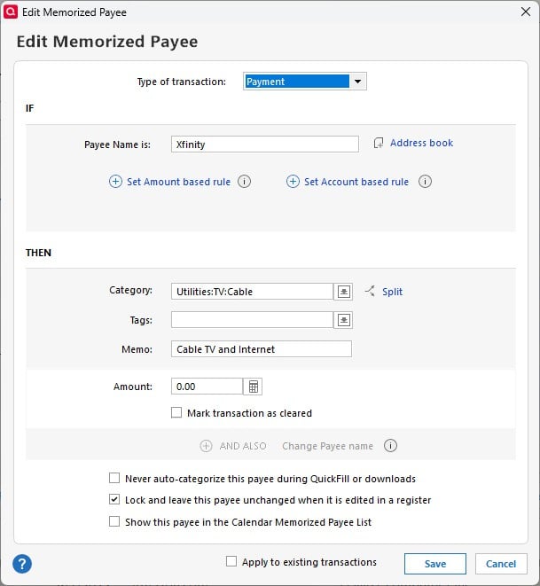 - Renaming rule: If payee contains "Comcast" change payee to "Xfinity"