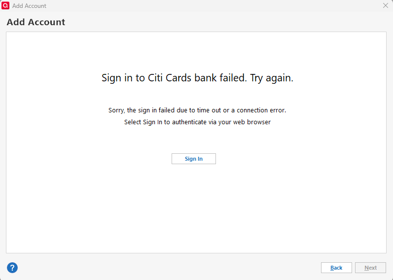 I am getting the following error trying to activate one step update for my Citibank credit card. The issue happens with I try setting it up for an existing account on the Online Services Tab of the Account Details screen AND when I try creating a brand new account.