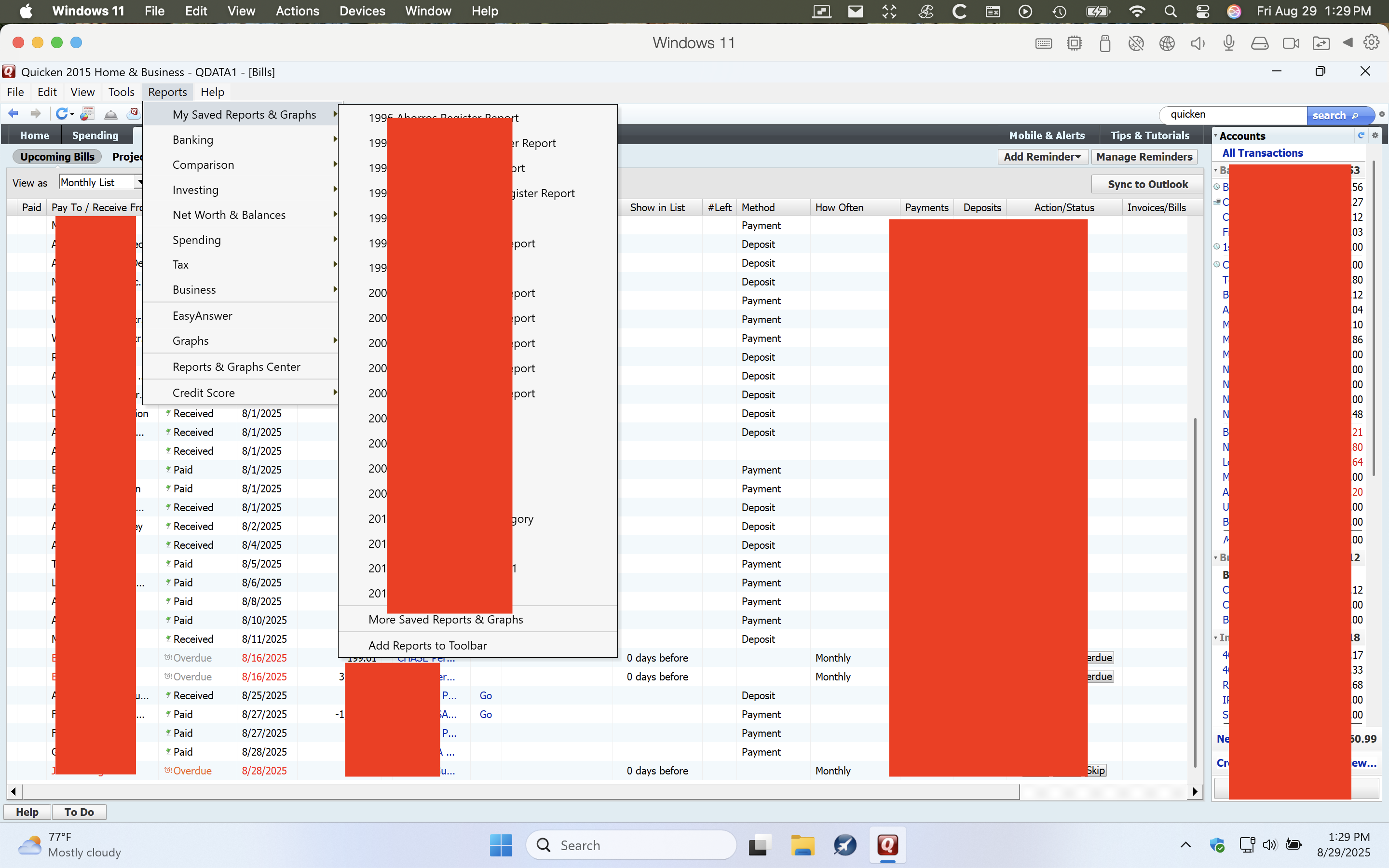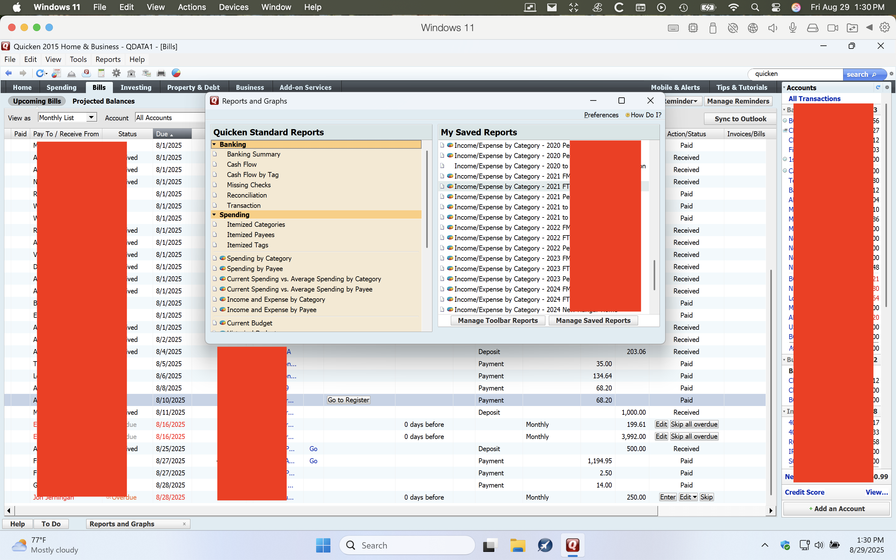 A couple of workarounds could be to keep Quicken 2015 on 2 other old Macbook laptops where I have it installed with Parallels and Windows 7. Those laptops never leave my office and I update the data weekly just to have more backups, so those reports should work forever, although very slowly on those old laptops, until both laptops decided to go belly up for some reason.