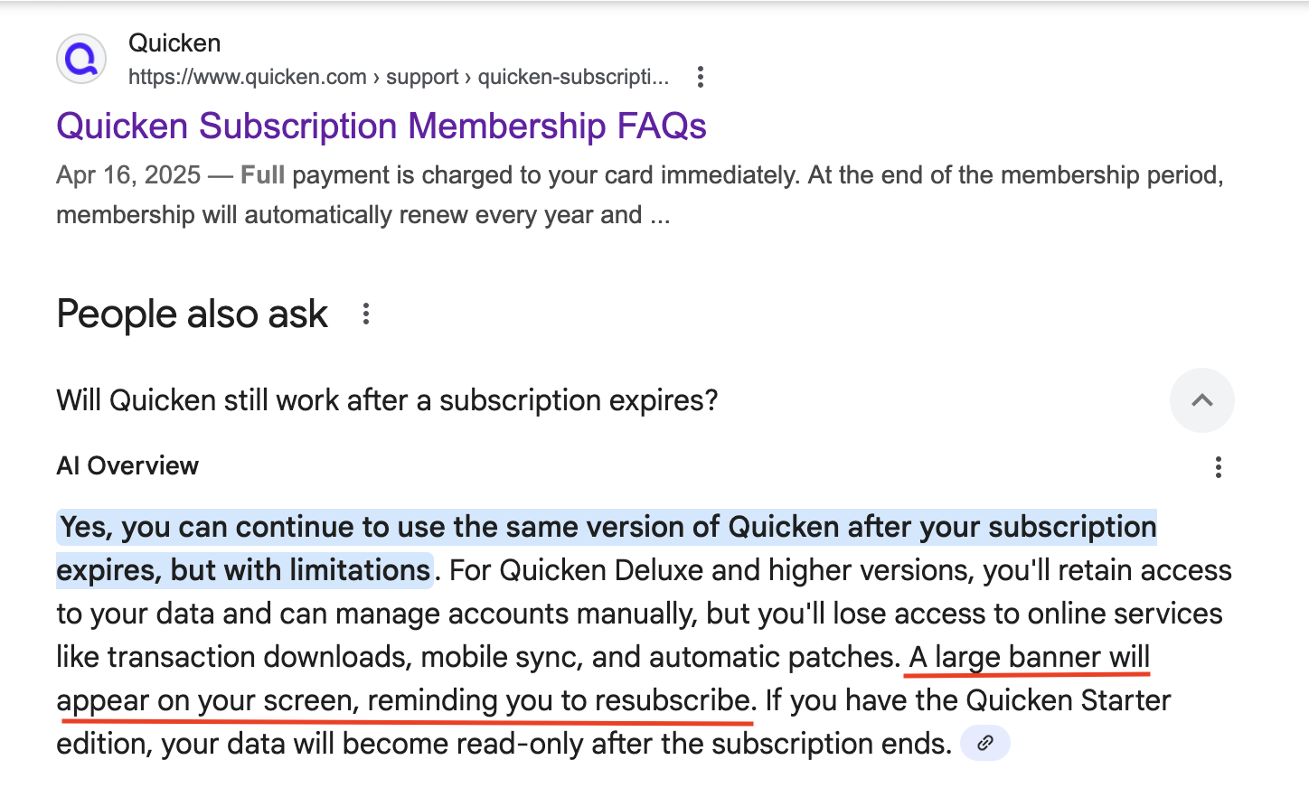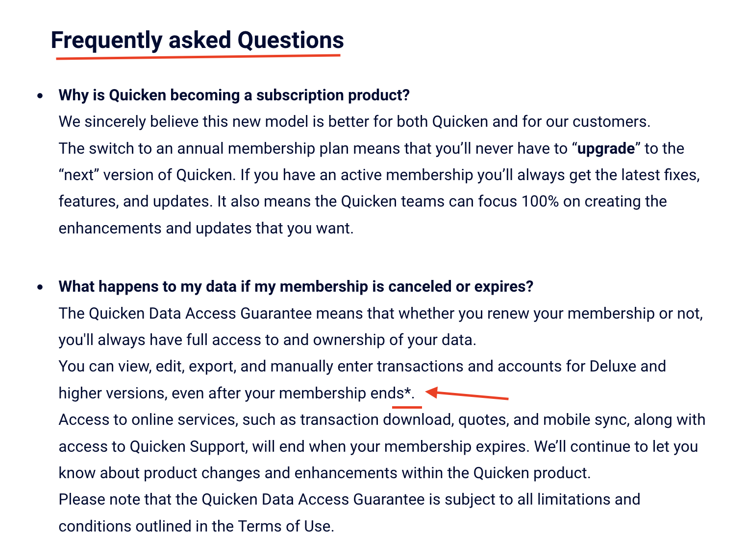For this last question I ask it here because I want to know what happens in REAL LIFE, because when I read the FAQs they curiously place an asterisk at the end of where they say that I have access to all of my data except the online services. You see what I use it for so I don't need any of those services that will go away, so would I end up essentially with what I have now but a better updated version of my current Quicken 2015 where I can do everything, or will it "crap out" (military technical term) after a certain time? I also found where it mentions a large banner reminding one to renew, does it cover up the data? Does it go away or stay there as long as you're using the program?