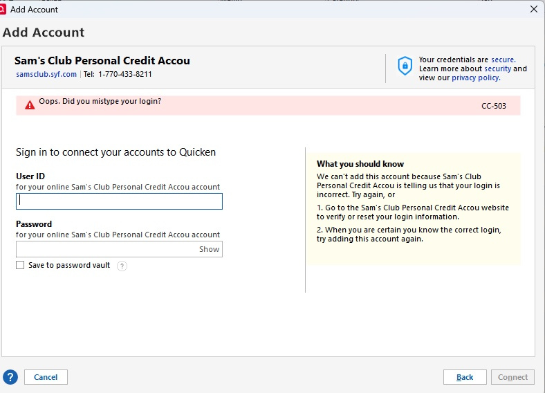 I keep getting the CC-503 Error when trying to sync my account with Sams. My user name and password works on the website but Quicken will not accept it?