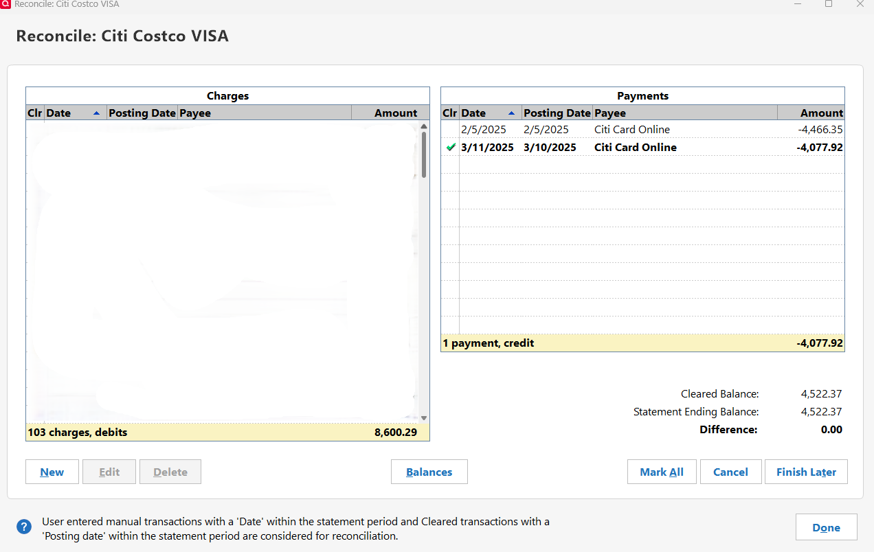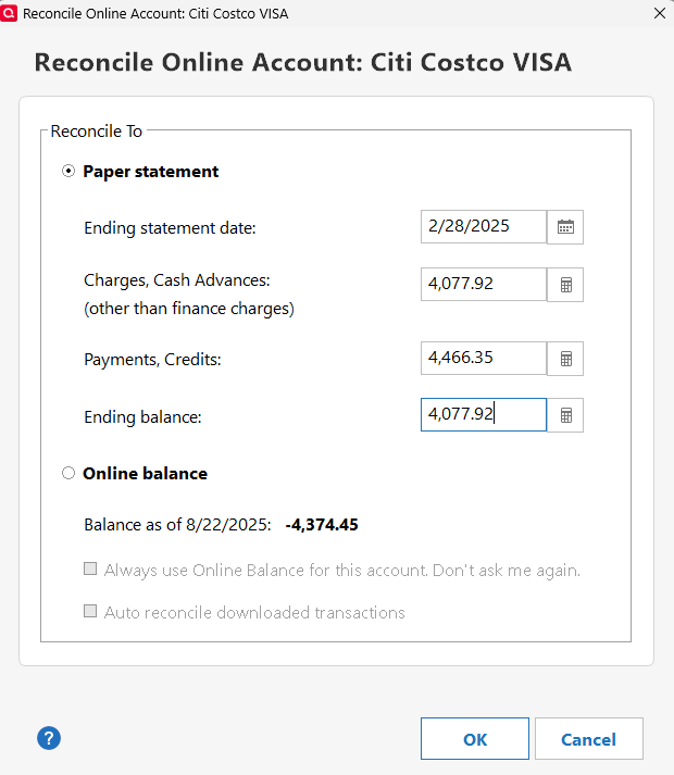Thanks to all for your help and questions. My prior balance was $4,466.35. Normally when reconciling I would see $8,544.27 in the Charges section, which equals $4,466.35+$4,077.92. When I reconcile the next month (March), it looks like this: