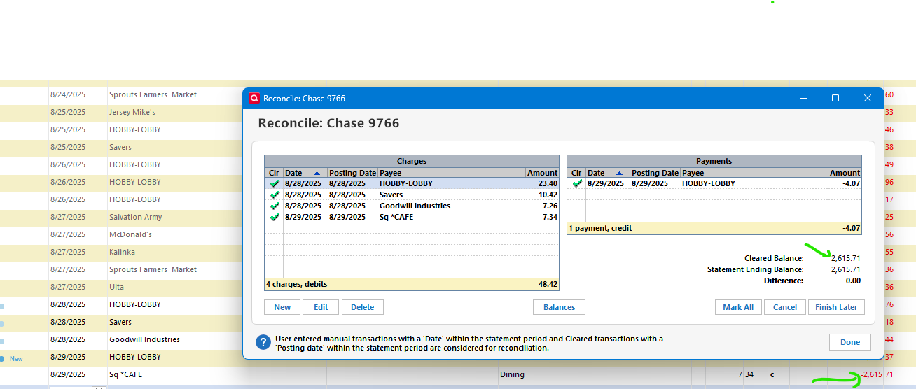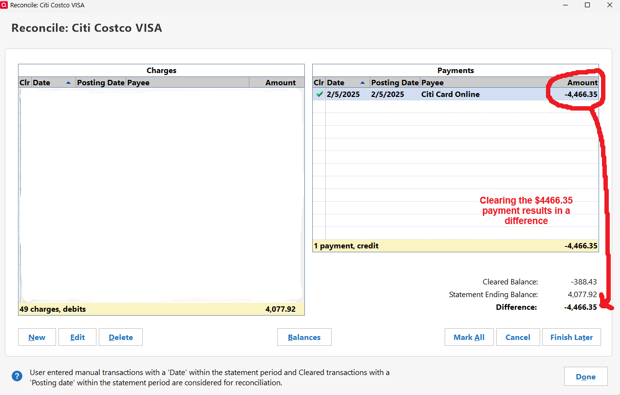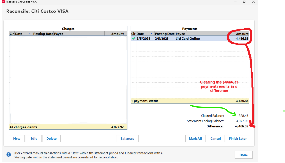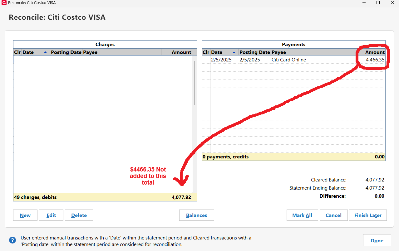 When I reconcile this credit card, the payment amount is normally added to the Charges total on the left. So when you clear the payment amount under Payments on the right it zeros out. For some reason it's not working. The subsequent month reconciles without any issues. Please help, thank you!