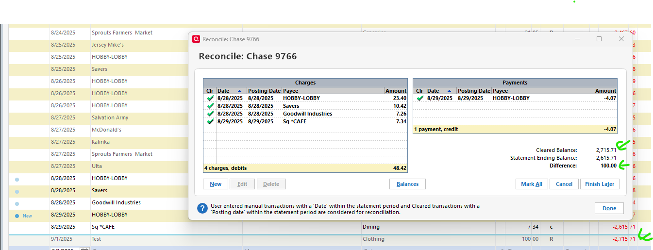 See what happens when I put in a reconciled transactions for $100 charge past the statement ending date.