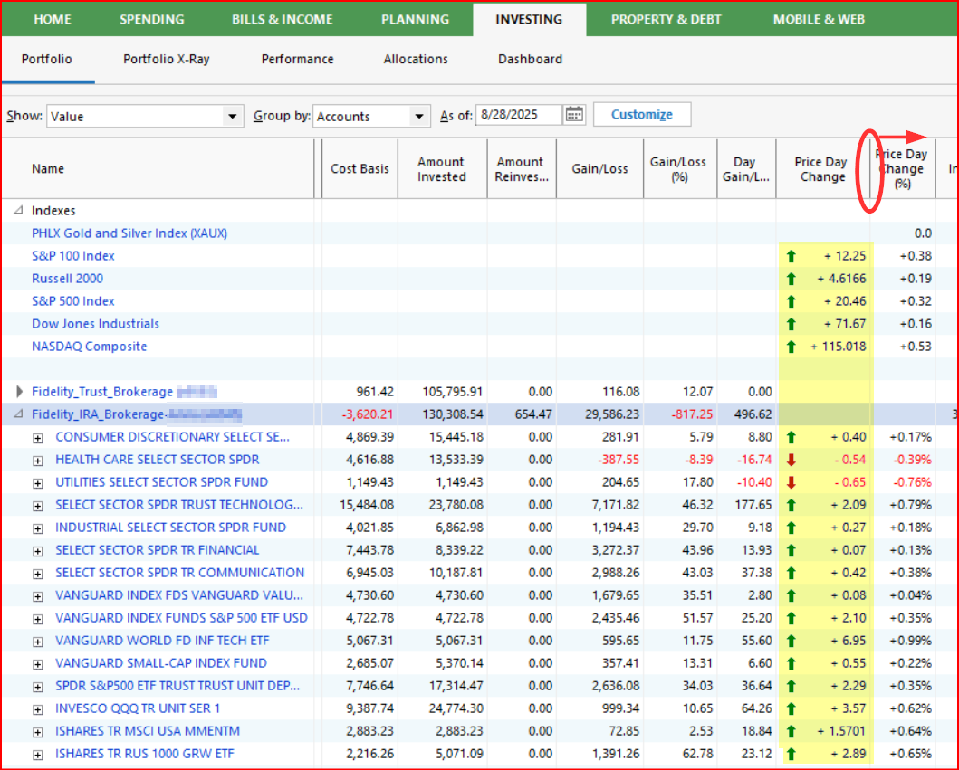 If so, this is what happens when the column width is too narrow. To fix this, click and hold on the column divider to the right of "Price Day Change" and move the cursor to the right. This will expand the column width and you will be able to see all of the changes in the column beneath the header like this.:
