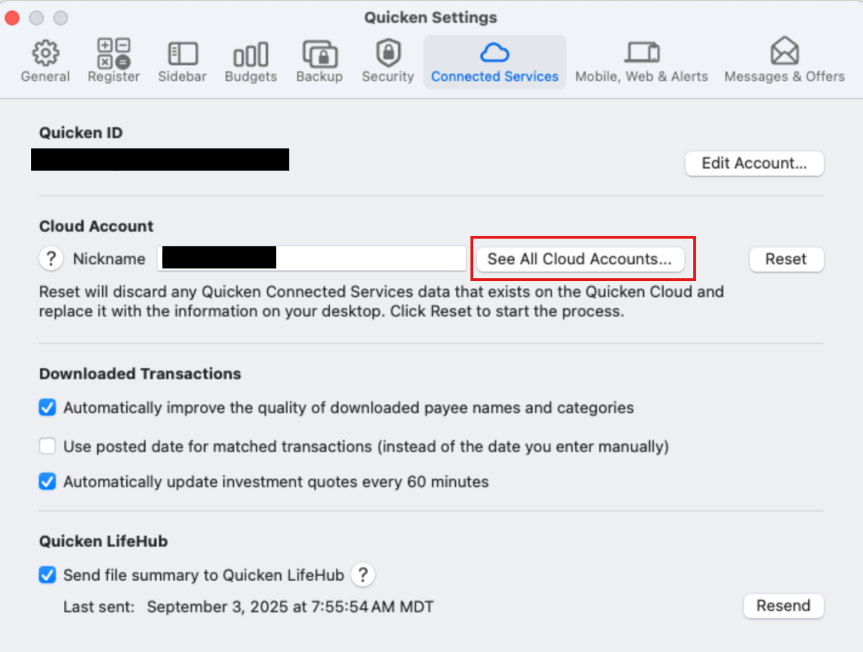 To do this, first, save a backup (just in case). Sign out of the Quicken Mobile app. Then, follow the instructions provided below to remove the cloud account from your main data file (this does not affect your data saved with your file).