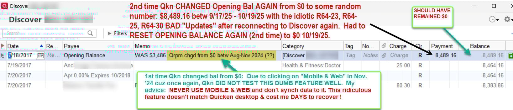 As I got to reconnecting other credit card accounts, I found that Quicken was CHANGING the beginning balances AGAIN (just like it did when I clicked on "Mobile & Web" ONE (1) TIME in Nov. of 2024 & it hosed ALL the beginning balances of my accounts!) I realize this statement is off-topic, but very important: WARNING: NEVER USE "Mobile & Web," because it only mirrors PART of your Quicken Desktop installation, and WILL CHANGE YOUR BEGINNING BALANCES, leaving you wondering why your "Running Balances" are all off! In fact, turn off "Synch" in Edit/Preferences/Mobile & Web to avoid more problems.