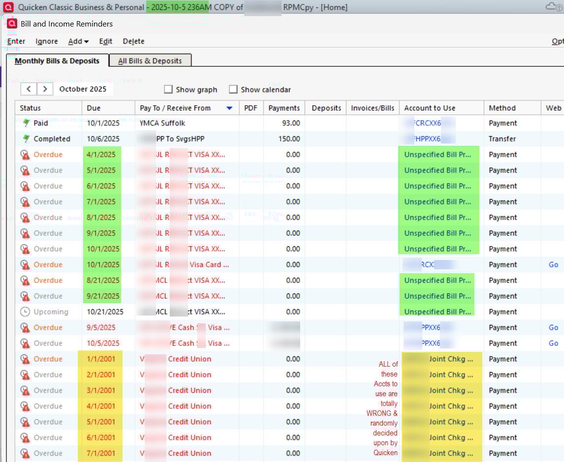 I was starting from a 10/5/25 COPY of the data, not BACKUP of the data. And here's just a sample of what my Mthly Bill and Income Reminders looked like with crazy dates due like 1/1/2001 and dates from earlier in 2025 which had already been paid: