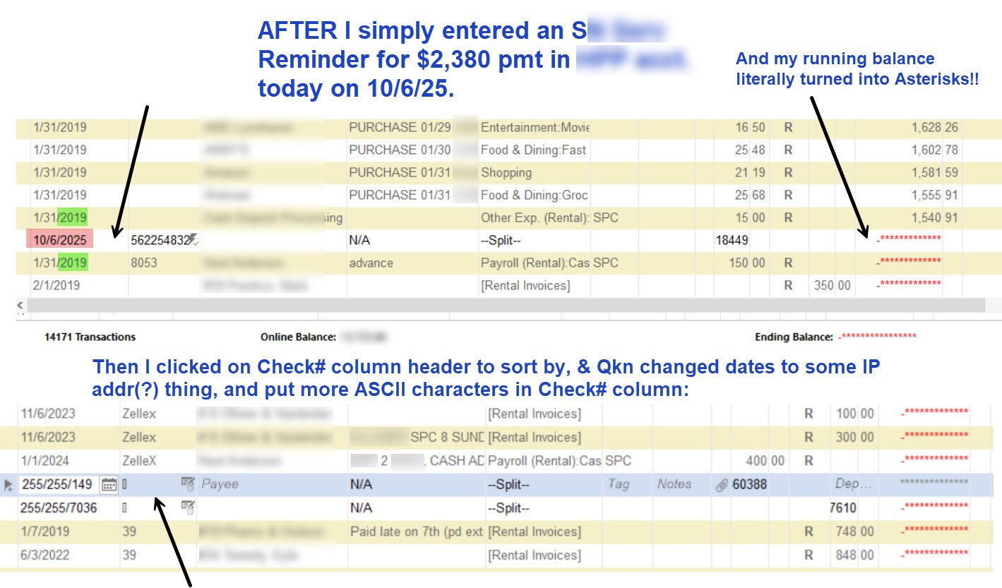 BEFORE updating to R64.30, while still using R64.25, on 10/6/25 I tried to salvage my data. I went through several gyrations, once ending up with unchangeable, uneditable, undeletable weird transactions with ASCII characters that turned my running balance column in an important account, INTO ASTERISKS. RED ASTERISKS: