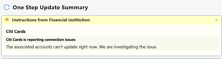 Citi Cards seem to be downloading OK now, but the yellow warning remains from when the downloads were failing. Is there a file to edit to get rid of the yellow warning?