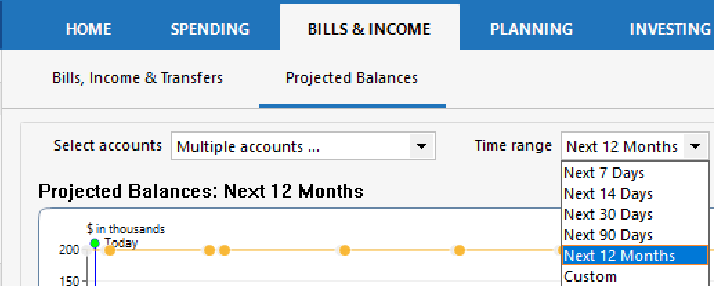 Thanks for reaching out! In the Projected Balances tab within Bills & Income, there’s a Time range filter dropdown that controls how far out your projections are shown.
