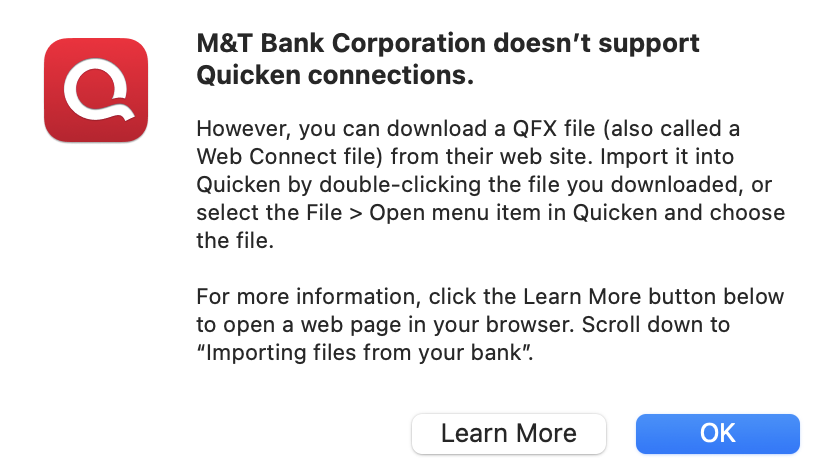 I use Quicken for Mac. I have connected multiple accounts with M&T Bank using Quicken Connect since the People's United merger with no issue. As of late August, the connection stopped working. I disconnected my account, and, when I try to reconnect, I now have an error that M&T Bank does not support Quicken connections (see screenshot). I do not believe this to be the case, and I believe that this is an aggregator error on the Quicken side.