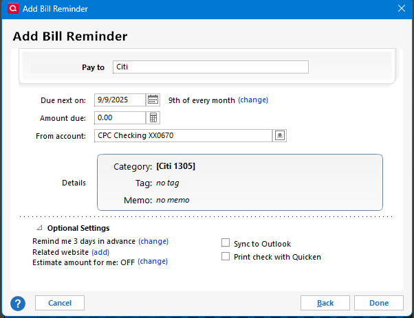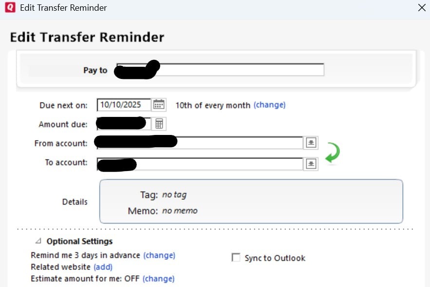 Ah, fair enough. If you don't mind, one more question that is driving me nuts. I'm trying to update the split amounts for a transfer reminder and all the info I can find makes it sound like I should be seeing a Category dropdown with a grayed out split icon next to it, but this is what I see when I "Edit this and all future instances" of the reminder. Clicking on the Details section shows I have a split in the Tag section (even though it says "no tag" here) but no way to edit anything.