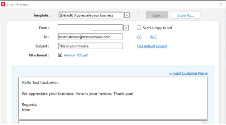 Thank you for reaching out with this question. Based on our article about emailing invoices, it doesn't look like there's a customizable template for the email itself. The article mentions that after you enter the email address, you should be able to choose between HTML or plain text. Are you seeing that option? If you do see that option, does it make any difference which one you select?