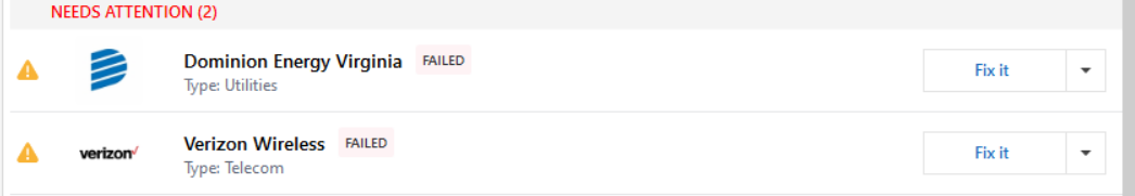 Just got upgraded to R64.23 27.1.64.23 which is supposed to improve billing. The update has only made billing harder. I attempted to "reconnect" to the following billers by following the prompts. The "reconnect" would show "pending" for several minutes. The "pending" was shortly (minutes) followed by the below "failed". I have followed this process several times since yesterday. The "Fix it" doesn't!