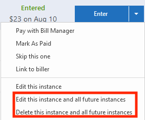 While the Bills & Income tab does not have a search function, you are able to filter by All Bills, Manual Bills, or Online Bills. Additionally, once you locate one instance of a reminder, if you need to edit or delete it, you can click the dropdown and select to do so for all instances.