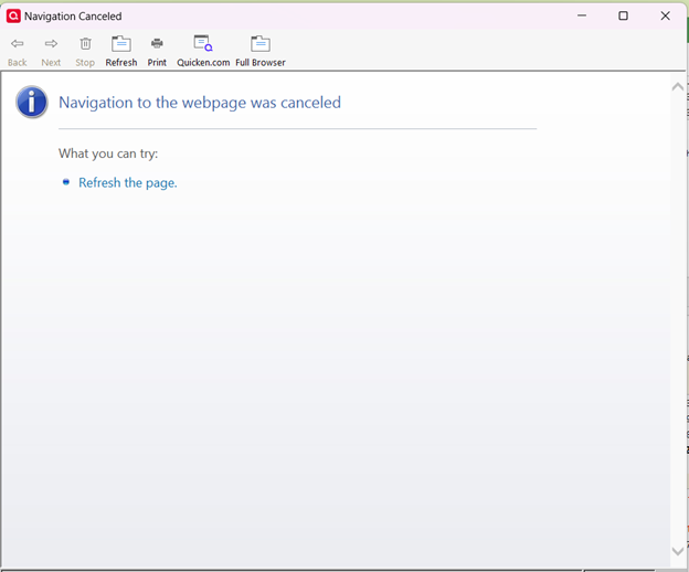 Over the last week or so I am routinely getting this "Navigation to the webpage was canceled" error when I try to open an account (any account) in Quicken. Once I get the error message, it doesn't matter which account I attempt to open, I get the error for every account. The only thing I can do is shut down & reopen the program, which sometimes helps and sometimes doesn't, in which case I just have to walk away & not work in Quicken. I see some other discussions about this, but am unsure what to do—I don't want to delete caches willy nilly. Would appreciate some help from Quicken.