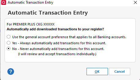 Start by closing and reopening your Quicken. If the issue persists, then please navigate to Tools>Account List and click the Edit button next to the problem account. On the Online Services tab, you should see a blue link that says "Automatic entry is".