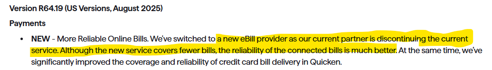 Thank you for coming to the Community to provide your feedback. Unfortunately, the new service provider does not support as many billers as the previous service provider did. They are working to expand the number of billers they will support in the future. For more information on the change, please review this article: