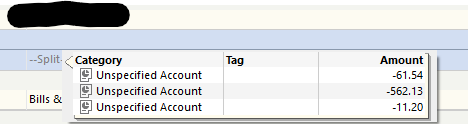 When I open the reminder from the 'clock' on the left of my register (edit this and all future entries) everything looks normal. When I hover over the split for the reminder transaction, however, I only see 3 lines all for debits and every account is shown as Unspecified Account.