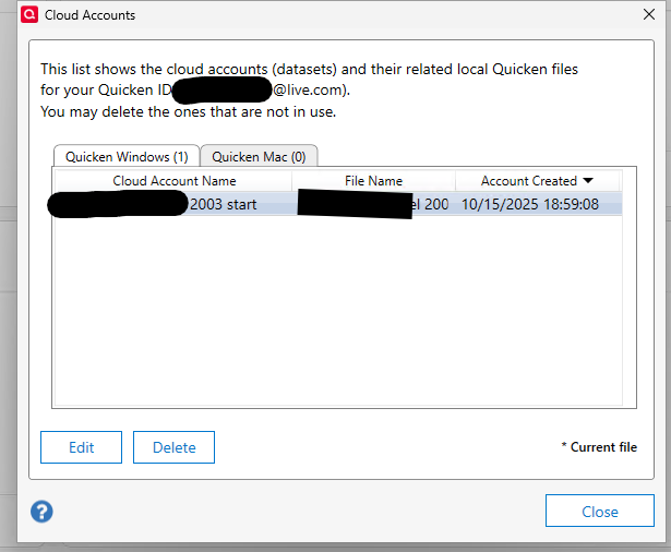 I still think something with cloud sync is broken. I was doing some testing with a different file and configuration and went to turn on Quicken Mobile & Web sync in that file…. and what did I find? Quicken tried to sync my main file back on the 15th of October. Even though I deleted ALL cloud files at that point and the production file does not have mobile & web enabled. That lines up with my previous post on the 15th in this thread, where it tried to sync randomly.