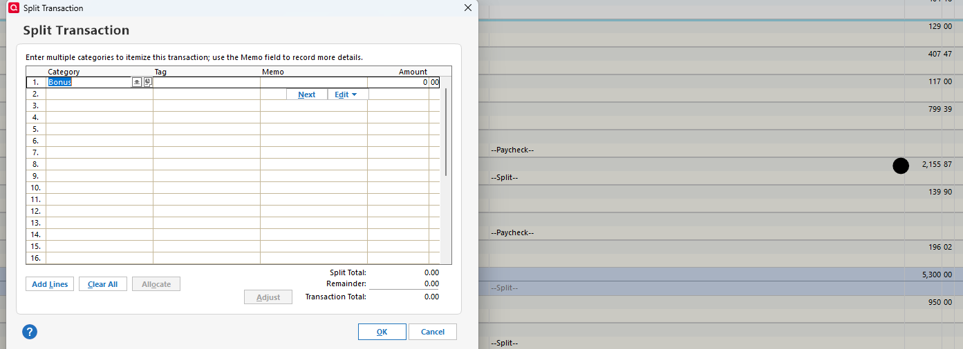 So a bit of a new take on this this week. In December, I have some RSU's that mature, usually twice a year roughly 6 months apart. So I've set reminders transactions to record a $0 transaction to my primary checking account that shows the 'bonus' (i.e. the value of the RSU's at vesting), all of the withholding for taxes, and then a transfer into a holding brokerage account my company has attached to the RSU where the stock resides.