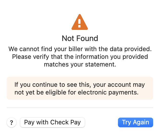 I have connected the accounts as e-bills successfully. But when attempting to pay with Quick Pay, I got that error along the way after entering biller name, account number, and biller zip code