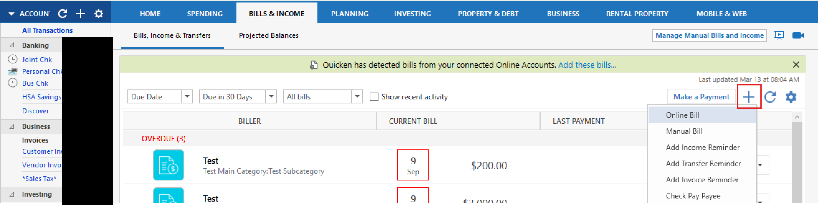 - In the Bills & Income tab, navigate to the plus sign (+) located on the top-right