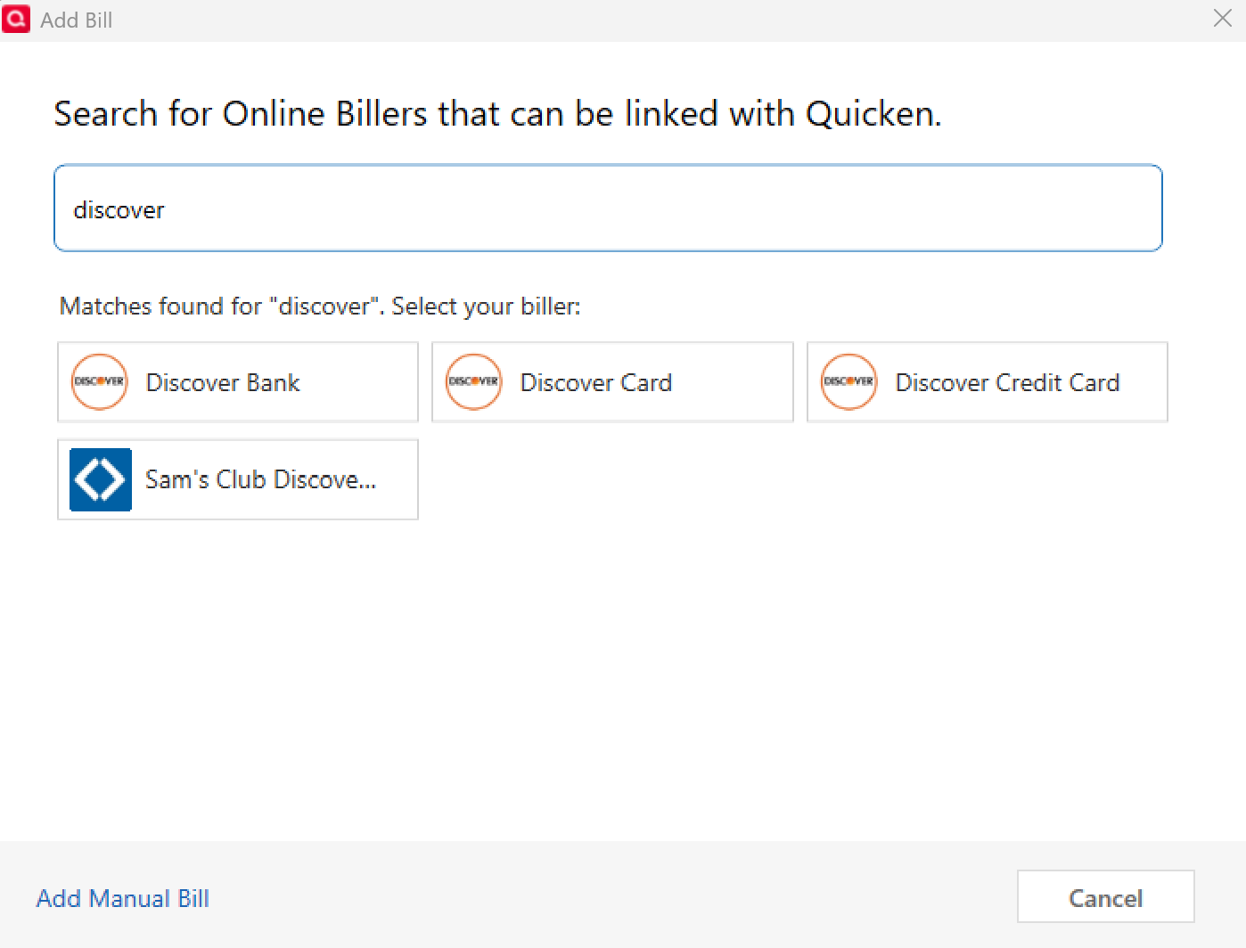 This should allow you to link your Discover credit card so that the bill updates automatically in Quicken without needing to add it as an account set up for transaction downloads.