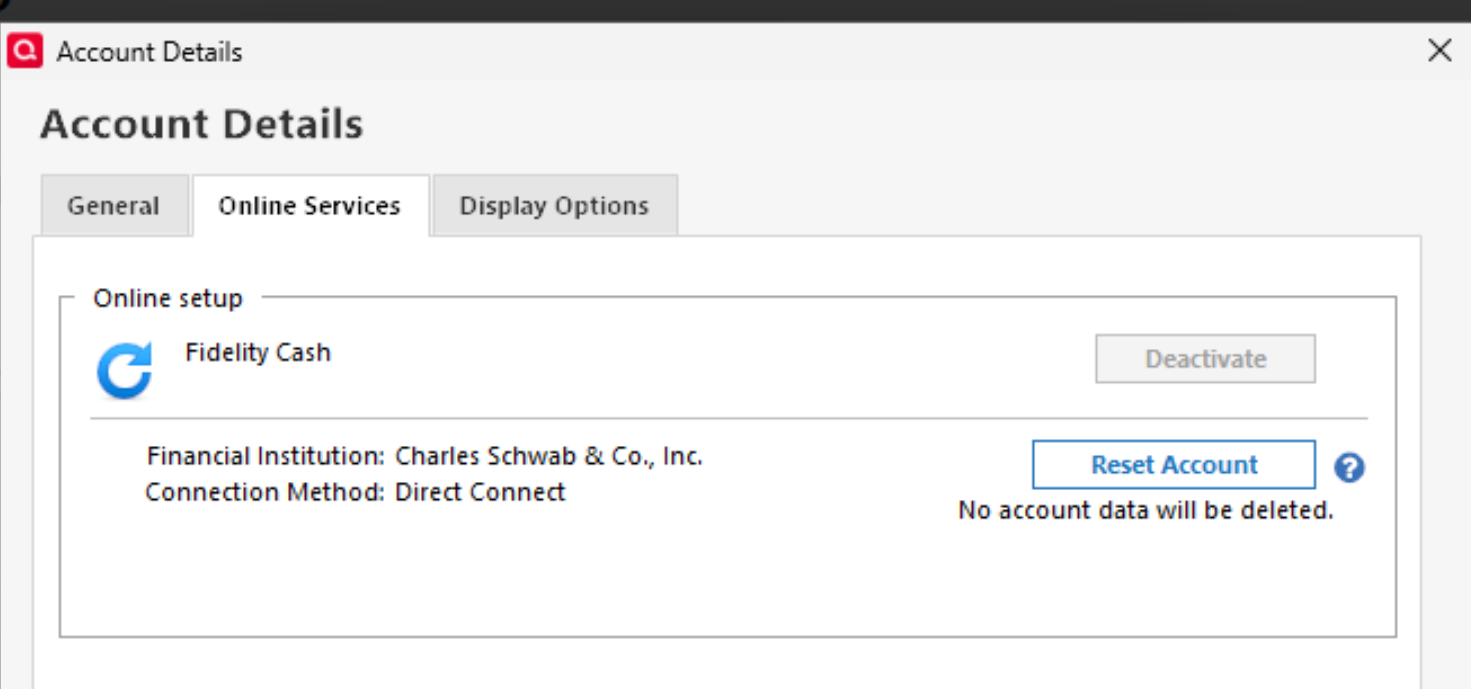 If you click on the Edit button in the account list and select the Online Services tab, what does it say for the Financial Institution and connection method?
