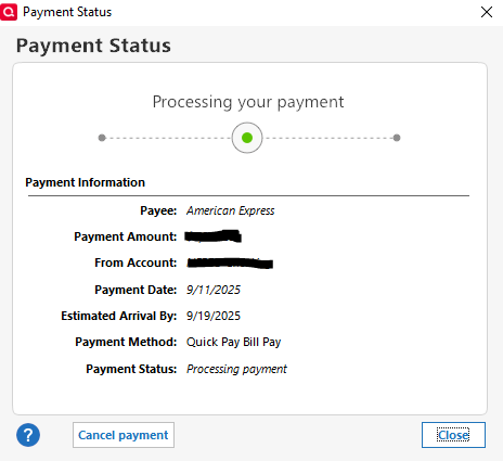 I don’t have another Quick Pay bill over $1,500 to test with (only Check Pay), so I can’t confirm whether this is AmEx-only or broader. What I can confirm is that this issue is not on the AmEx side.