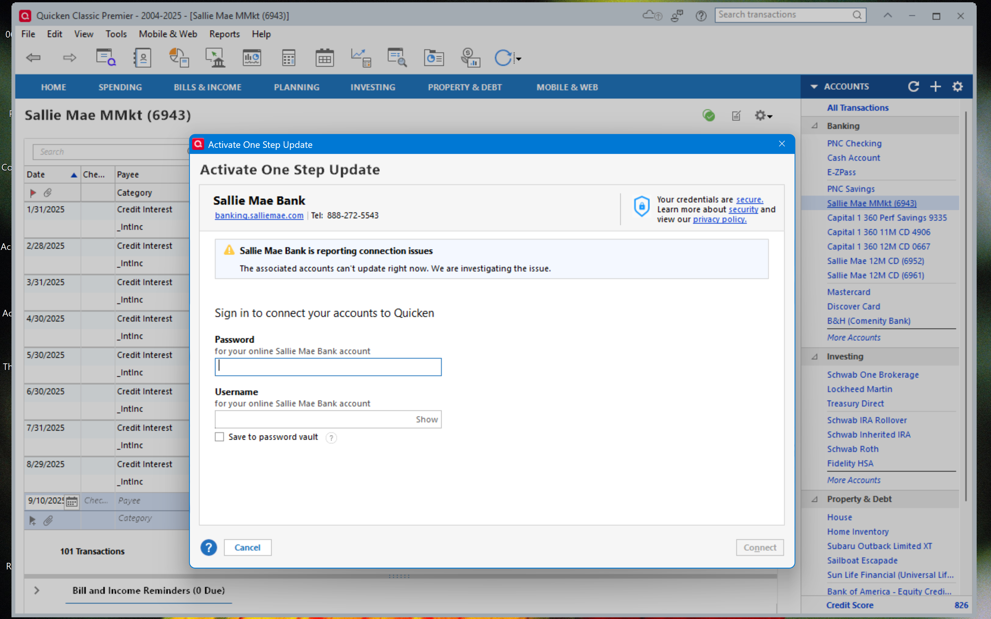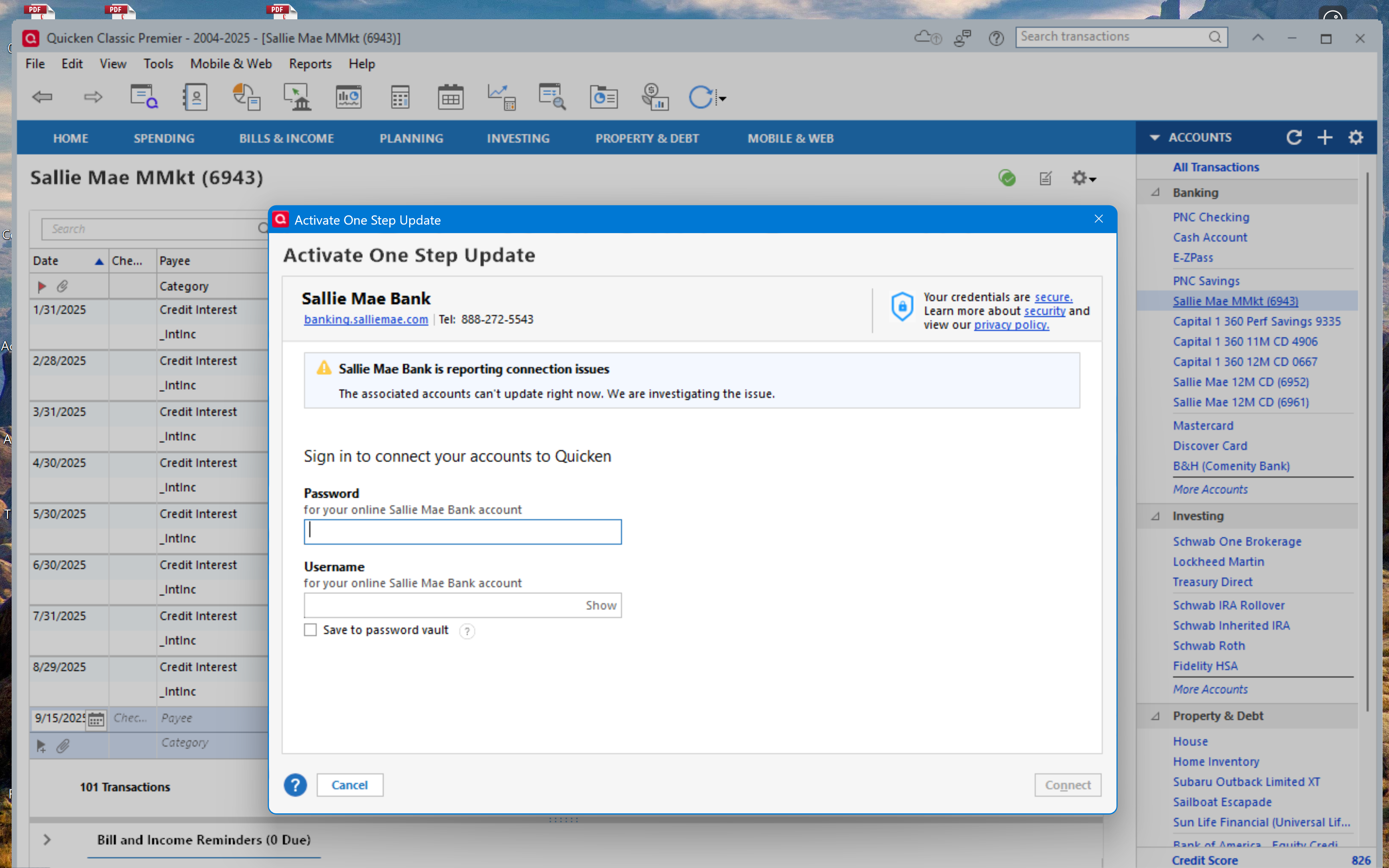 I was last able to successfully connect to Sallie Mae Bank via Quicken on 9/7/25. Yesterday (9/21/25), it failed (right after Quicken updated it's s/w and my subscription):