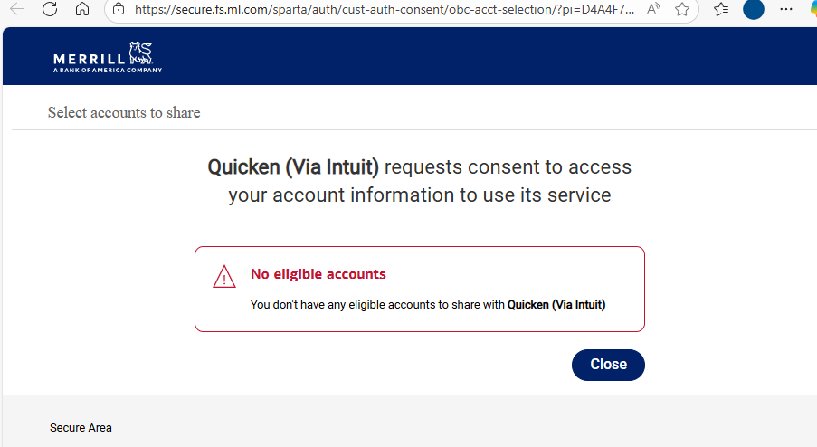 Regarding the 'No Elegible Accounts' message it comes from Merrill after signing in to reauthorize. These are brokerage accounts.