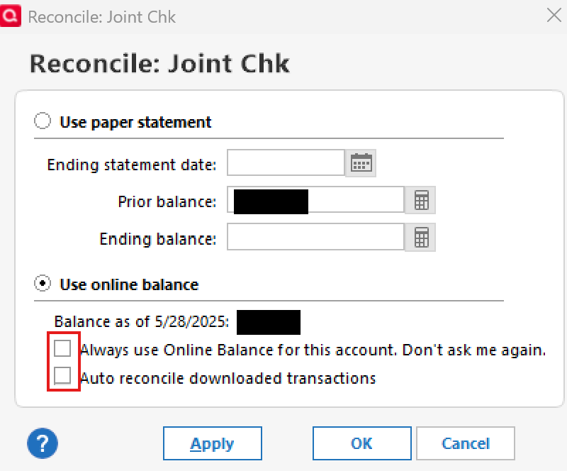 - On the next screen, under the Online Balance section, uncheck the two boxes there. Especially the 2nd box titled Auto reconcile downloaded transactions.