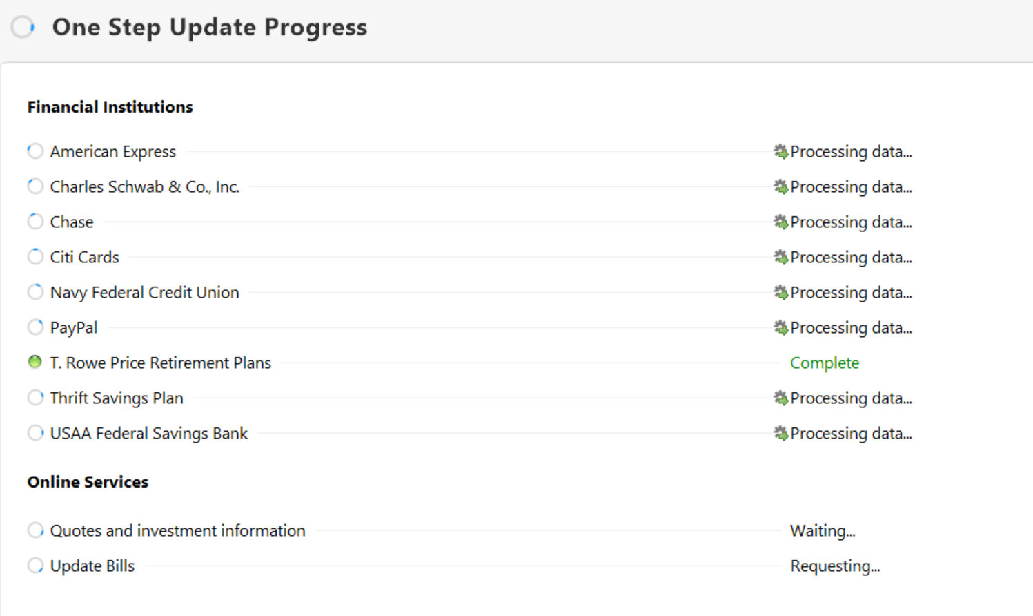 I updated to R64.25 today, and now when I perform one step update, the process freezes after only updating one account: