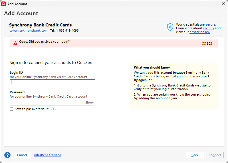 Cant' Connect Walmart OnePay Cash Rewards Synchrony Bank With Quicken