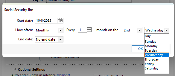 For those of us who receive social security, our monthly check is deposited on the nth day of the month. For me, that is the 3rd Wednesday of every month. Quicken doesn't support this kind of option in the setup for a repeating deposit. It would be most helpful in the App could support this kind of date management.