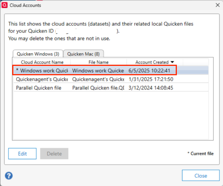 You would then verify in your Quicken application that the file you are viewing there is the same. You can do that by going to Edit>Preferences>Quicken ID & Cloud Accounts>Cloud Accounts associated with this Quicken ID. The dataset associated with the file you are currently in will be highlighted.