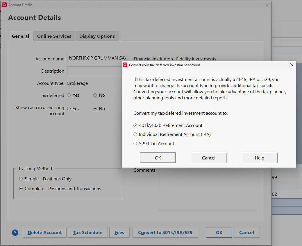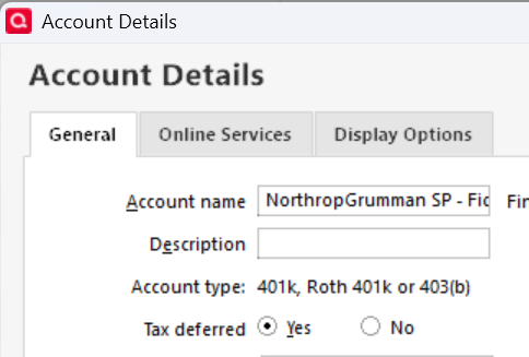 As part of my testing this new Fidelity Investments connection type, I've set up a new test datafile using version R64.25 and added my Fidelity accounts that include a 401k from their Netbenefits organization. Unfortunately, there is no provision presented to define this account as either a 401k, Roth 401k, or 403b type account as was available in the past using the direct connection type. I have not seen this problem reported before. Here is the legacy account configuration in Quicken: