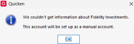 When I receive the conversion screen for the transition to the new Fidelity Connection method, I click on the conversion button and get then the message, "We couldn't get information about Fidelity Investments. This account will be set up as a manual account. OK