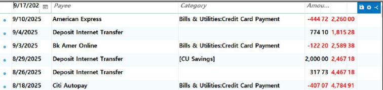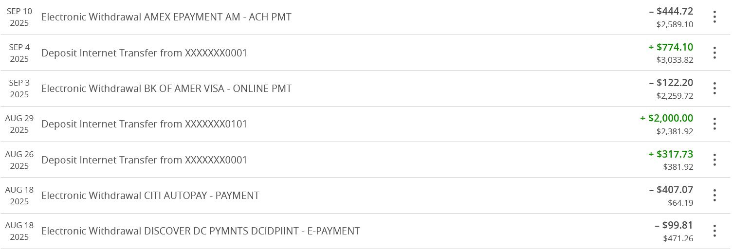 Deposits are all black and I see no strange ones. I am not able to double check past 8/13/2024 because that is all I can see in my online credit account. (they brought in more than I can verify…I had no date range choice).