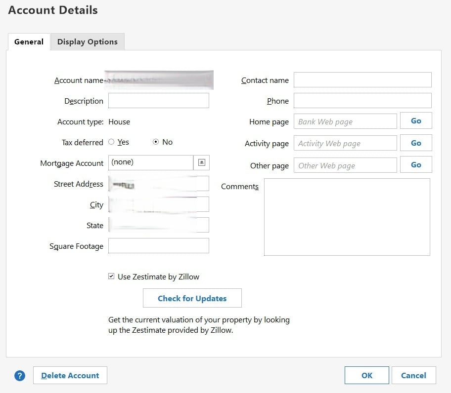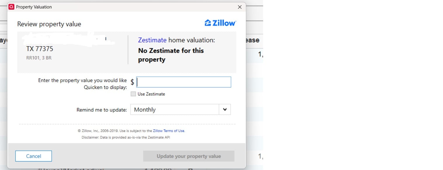I seem to recall that issue & I had it about a year-or-so ago. If I recall I opend the Account Details and unchecked the box "Use Zestimate by Zillow" in the General tab and closed it. Then reopened it and rechecked the box again and then clicked "Check for Updates". Exited out by clicking OK. The Account still updates when I want it to without needing to go back to the Account Details and resetting the check box.