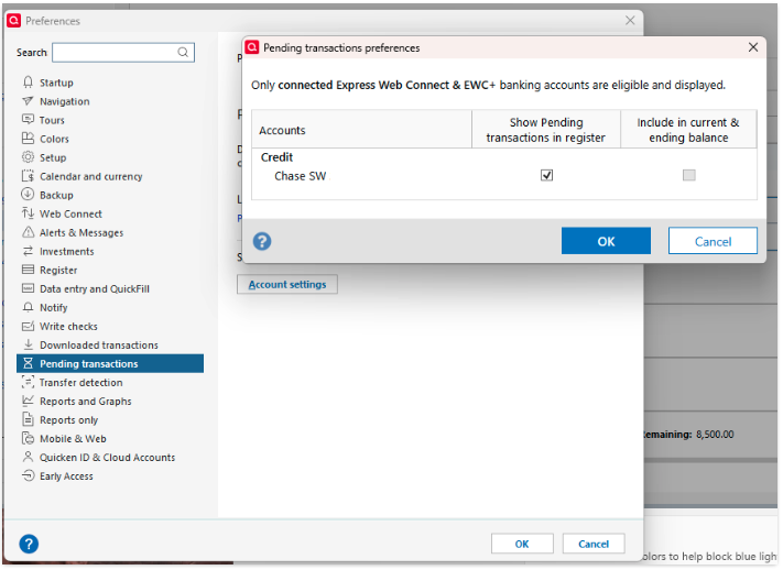 I then decided to poke around in Quicken myself and found the Preferences->Pending Transactions! So I set it up again, only to discover Chase bank doesn't support downloading pending transactions. Why then was I given the option during the link process to choose between "show pending transactions in register" and/or "include in current ending balance" as shown in the screen shot below. Since one is grayed out it leads one to believe that that the other is in fact supported. Quicken needs to update their system to show valid information either before or during the link process to avoid the user from wasting their time, which I assume is why the setting is there in the first place.