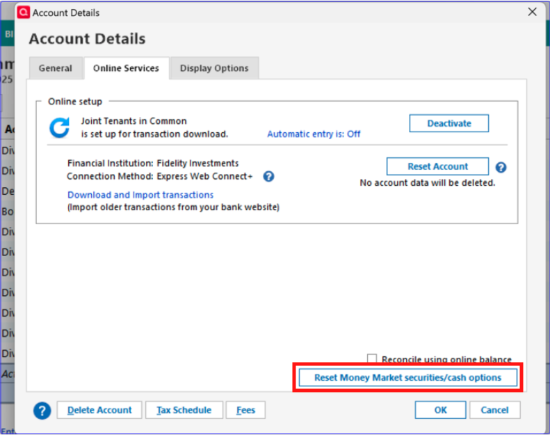 I rechecked all the Fidelity accounts and they all now show the reset cash position option. That is different from prior runs when some accounts showed the option and then didn't show when revisiting account details. However, according the pop-up description, this option does not fix past transactions, only future downloaded transactions. Correct?