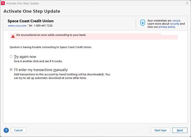 I'm adding this as a repeat or continuation of same subject discussed and closed during Jun-Aug 2025. SCCU transactions still fail to load into Quicken during the One Step Update (OSU) process. However, deposits, etc do show on sccu.com.